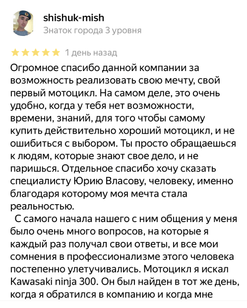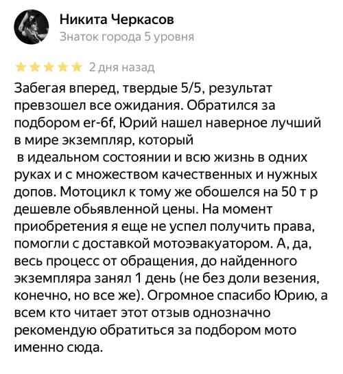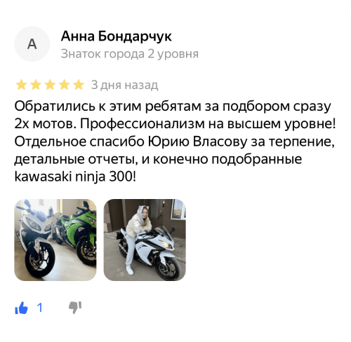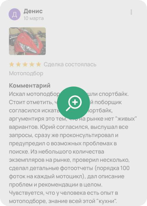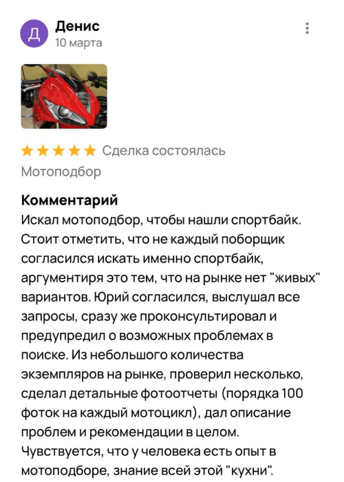 Основываясь на полученном опыте я решил стать частным специалистом по мотоподбору, чтобы оказывать максимально качественную услугу и исключить минусы и недочеты, которые встречаются при обращении за данной услугой в различные компании или к другим частным специалистам.